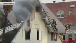 VIDEO: A firefighter fell several feet from a ladder while battling a house fire in Arlington Heights on Saturday evening, video shows.