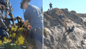 The dog, which was not familiar with the area, slipped on some vegetation, lost its traction and fell over the cliff, said Rescue Captain Samuel Menchaca of the San Francisco Fire Department. Firefighters sent a team to retrieve the canine, which had found temporary refuge on a ledge about 40 feet below the top of the cliff. A San Francisco police drone operator who happened to be in the area heard the emergency call go out and captured an aerial view of the dog’s location, which he relayed to firefighters.