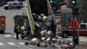 VIDEO/PHOTOS: First responders shut down part of Wisconsin Avenue Monday morning after an industrial dumpster caught fire. In a post on the X platform shortly before 11 a.m., the DC Fire and EMS Department said firefighters were called to the 1800 block of Wisconsin Ave. for a construction dumpster on fire in a parking garage. Crews knocked down the flames and were working on removing the dumpster from the Safeway garage while clearing the smoke. Photos from the scene showed crews moving the dumpster with a truck into the street, with scorched trash spilling into the roadway. The fire department said crews removed the trash from the dumpster and wetted it down, preventing another fire from rekindling. Fire investigators continue to investigate the cause of the blaze; however, no one was injured.