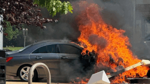 Firefighters said the driver was able to escape the car without any injuries. Crews extinguished the blaze as the fire department’s hazmat unit managed the fuel spill.