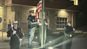 The event featured the National Moment of Silence, a flag-lowering ceremony, and brief comments from Meridian dignitaries and first responders. Meridian Mayor Robert Simison, Meridian Police Chief Tracy Basterrechea, members of the Meridian City Council, and representatives from the Meridian Police and Fire Departments participated in the ceremony.