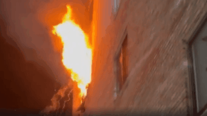 Upon arrival, crews saw flames emitting from the 4th floor of an 8-story multi-family dwelling. Video taken by the fire department shows the fire through a window with smoky objects falling.