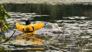 โThis was a good opportunity for our members to take the training they received and apply it in the real world in a less time-sensitive situation,โ said District Chief Mike Maitland. โWhen the day comes that our firefighters need to conduct a water rescue involving a person, they will be better prepared.โ Animal Control was also sent to assist in the rescue operation. The swan initially resisted efforts to help, but firefighters were able to free it, allowing it to swim away quickly.
