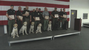VIDEO/PHOTOS: Thursday morning in Bridgewater, seven K-9s went from student to detective! After three months, the friendly and energetic labs are now joining the Massachusetts Police Fire and Explosion Investigation Unit, a process that turns a man’s best friend into their fiercest protector.
