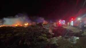 VIDEO: Nobody is injured after a hay bale fire drew a response from three different departments. The fire started around 7:00 Saturday night at a feedlot roughly eight miles south of Norfolk. Firefighters and tanker trucks from Norfolk, Madison and Stanton all responded to the blaze. Video from the scene shows workers using heavy machinery to spread out the hay. Norfolk Fire officials say that allows the fire to burn out more quickly.