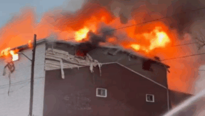 When firefighters arrived, they encountered heavy fire and smoke coming from an apartment building and the fire was spreading to a second building.
