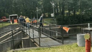 Officials set up booms to contain the material, which the New Hampshire Department of Environmental Services said appears to be broken-down organic material and minerals. Officials said the substance does not pose a threat to public health. Additional testing is being conducted to rule out petroleum products. To prevent the sheen from moving downstream, the DES Dam Bureau closed the dam at Powwow Pond. The cause of the sheen remains unknown.