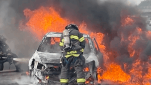 Photos show the vehicle completely engulfed. Fire crews say the flames were quickly put out after the fuel tank ruptured. No one was hurt.