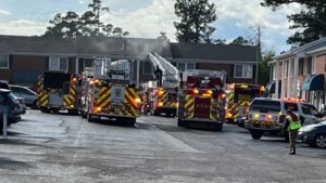 Officers and firefighters responded to a call just after 1 p.m. about a fire in an apartment complex in the 6400 block of Yadkin Road, according to a news release.