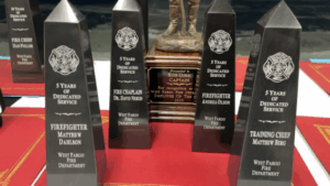 The West Fargo Fire Department took a break from their busy schedule on December 4 to reflect on the accomplishments of the past year. They held their annual Awards Ceremony at their headquarters on 10th Avenue East. The department handed out several pieces of hardware โ including one for 35 years of service to Deputy Chief Dell Sprecher and โFirefighter of the Yearโ to Captain Rob Dirk.