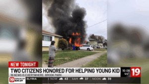 Another man John Fumich, was driving when he saw the fire, stopped, and was able to reach the child and get them to safety. Rienerth remained at the scene to provide care, comfort, and support to the family until further emergency support arrived,โ according to the recognition.