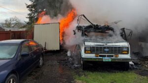 PHOTOS: One person was hurt when a motorhome caught fire in the Dilley community just outside Forest Grove on Saturday afternoon, according to Forest Grove Fire & Rescue. Just after 3 p.m., crews were sent to an address near Southwest Bantam Avenue and Southwest Dudney Avenue, where they found multiple structures on fire.