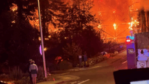 PHOTOS: A fire on a wooden train trestle close to an apartment complex in Newberg prompted response from multiple emergency crews early Sunday morning. Just before 3 a.m., crews from both Tualatin Valley Fire & Rescue and Dundee Fire arrived at scene, finding heavy flames burning through the elevated trestle, “dangerously close” to a nearby apartment complex, officials said. Corinne Tate – who lives with her husband, Tom in a home directly overlooking the trestle – recalled the moment firefighters came knocking on her door at the time the fire broke out, requiring them to evacuate.