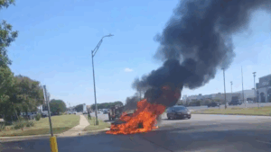 The driver, David Thayer, said he was bringing the vehicle to the Kia Dealership for a recall issue when the flames began. “I was bringing my car into Kia to get it checked out, and it blew something and caught fire,” Thayer shared. “I hurt my leg a little bit. But other than that, I’m fine.” Thayer, the only occupant, escaped safely before the vehicle was fully engulfed.