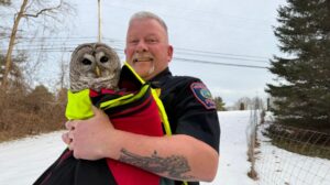 Chief Kevin McAllister saw a barred owl being harassed by crows while on his way to the station. The fire chief found that the owl was hurt and unable to fly.