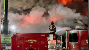 The fire sent up a large plume of smoke near the waterfront. More than 40 firefighters worked to extinguish the fire throughout the night into Wednesday morning. โDue to the size of the pile and the nature of the metal, some of that (material) can react violently to water,โ Vancouver Fire captain Joe Hudson said. โBecause itโs in a pile, we tried to apply quite a bit of foam to try and suppress the vapors.โ