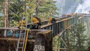PHOTOS: The Vance Creek Bridge in Mason County, the second-highest railroad arch bridge in the country, caught fire on July 31, the Lacey Fire Department posted on Facebook. Crews from the Department of Natural Resources, Thurston County, and other agencies responded to assist with the fire. Embers fell over 300 feet from the bridge, which also caused a secondary fire in the canyon below, Lacy Fire says. Firefighters battled throughout the day and eventually contained both fires by 9 p.m. that night.