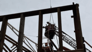 The fire department said each worker was about 25 feet up in the basket of their lift and were pinned. One of the workers was under around 10 trusses.