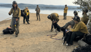 “It’s sometimes hard to completely get the smell off you when you’re working outside,” Gage said. “Even the smell of bar oil or fire on you, the smell of your clothes from working in the day.” That’s right. Bears like bar oil โ the stuff firefighters use to lubricate their chainsaws. Sometimes, big, furry problems call for big, furry solutions. Enter Mardy and Sky, a mother-daughter team of Karelian bear dogs. Late last month, the two big, fluffy, black-and-white dogs joined about 50 firefighters at a camp near the roughly 23,000 acre Twelvemile Fire, southeast of Delta Junction.