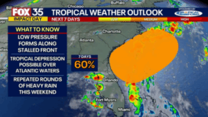 A potential tropical disturbance headed towards the Southeastern United States is likely to bring heavy rains to the state over the Fourth of July weekend, according to the FOX 35 Storm Team and the National Hurricane Center (NHC). The NHC said in its latest update that a frontal boundary is expected to stall and weaken off the U.S. Gulf Coast this week.