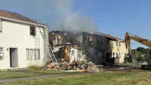 Just after 3 p.m., firefighters were called to 5 Thompson Road and found heavy fire in a two-story, 20-unit apartment building. By the time crews arrived, the fire had spread up the back of the building and reached the roof. More than a dozen departments responded to the fire, including from Bangor and the Air National Guard. The high temperature in the area was 97 degrees Tuesday, creating significant challenges for crews as firefighters dealt with exhaustion from the heat.
