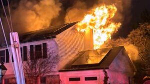 There, the fire could be seen coming from the roof of the two-and-a-half-story home where roughly 60 firefighters battled the flames.
