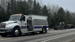 The semi was destroyed by the flames, the Lakeland Fire Department calling it a complete loss. Authorities say the fire was contained to the semi, with minimal fire spreading to the grass. There were no injuries, and the cause of the fire is still unknown.