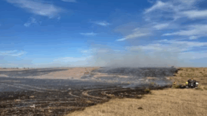 The Stinnett Fire Department says crews will continue to monitor the situation and conduct thorough mop-up operations to prevent any potential flare-ups. Officials say the cause of this fire was due to chains dragging.