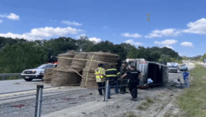 VIDEO: A truck hauling hay bales overturned on I-79 in Marion County Sunday afternoon. The accident occurred at approximately 3 p.m. at the 130 mile marker, just before the Harrison County line, in the southbound lanes, according to the Valley Volunteer Fire Department. When crews arrived on scene, they found a pickup truck and trailer hauling round bales on its side into the cable barriers. Both occupants of the vehicle had gotten out of the vehicle with the help of Good Samaritans and were not injured, officials said. I-79 South was restricted to a single lane for approximately three hours while the accident was cleaned up. Hillbilly Towing helped recover the truck, trailer and hay bales safely alongside firefighters, officials said. The Marion County Rescue Squad, West Virginia State Police and White Hall Police assisted the Valley VFD on scene.